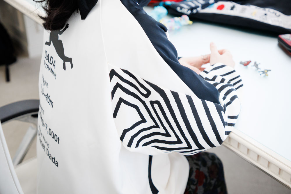 石川いま月脚さんに着ていただいている「ダダ プロフィール」ブルゾンです。「三面怪人」という二つ名の通りフロントにちゃんと三面、刺繍で入れています。袖に体の模様をプリントしました。ダダの模様はかっこいいですよね。