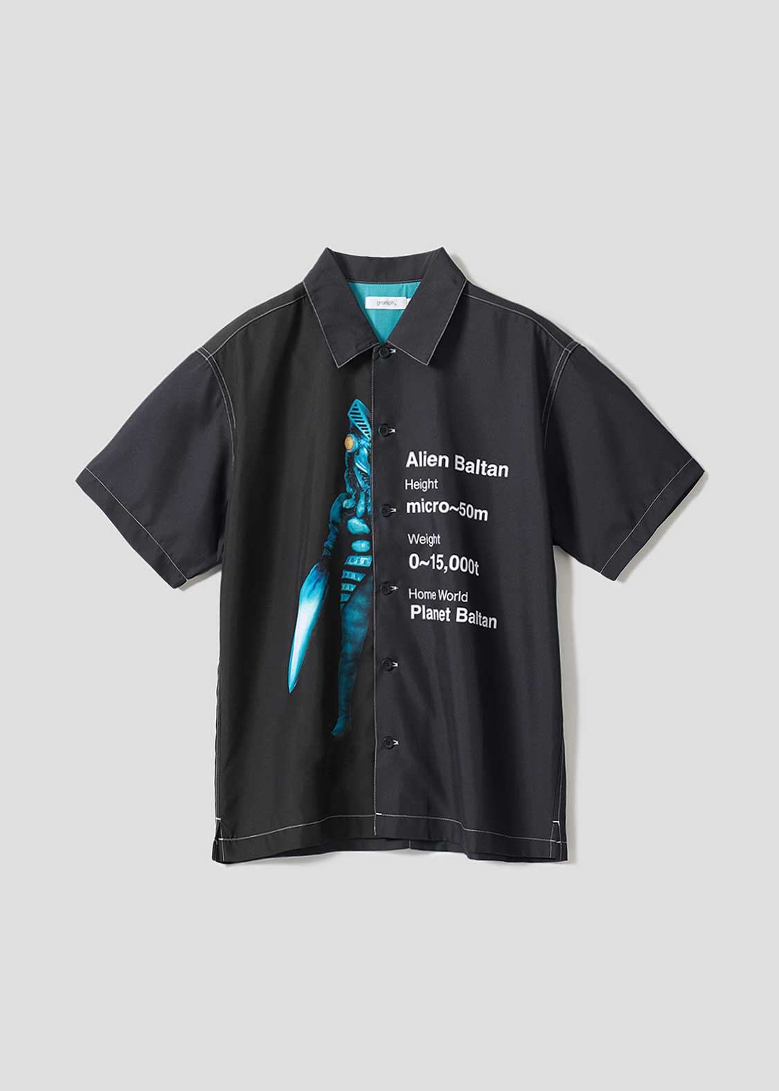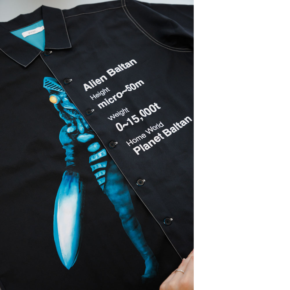 石川次は「バルタン星人 プロフィール」という半袖シャツです。怪獣を360度活かそうという、まさに今回のコンセプトを表すデザインを作らせていただきました。