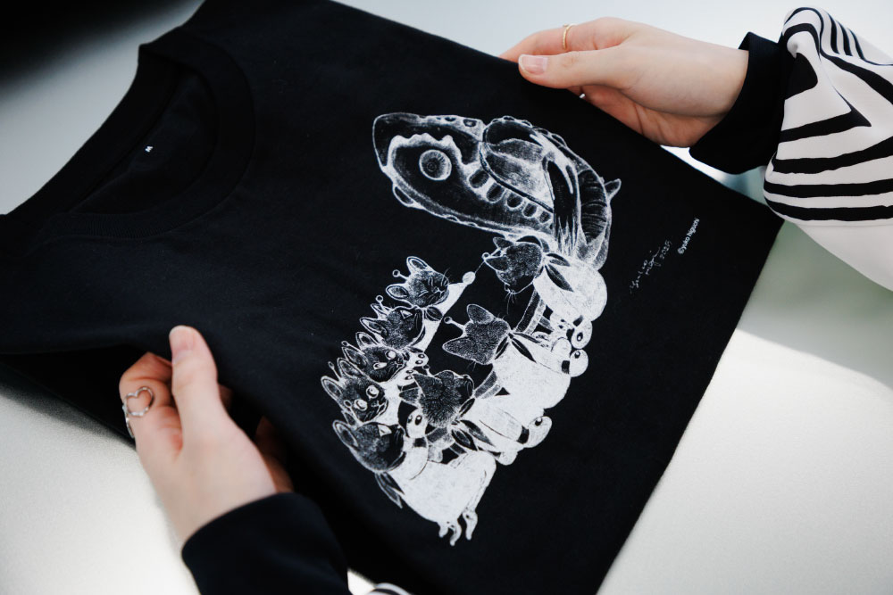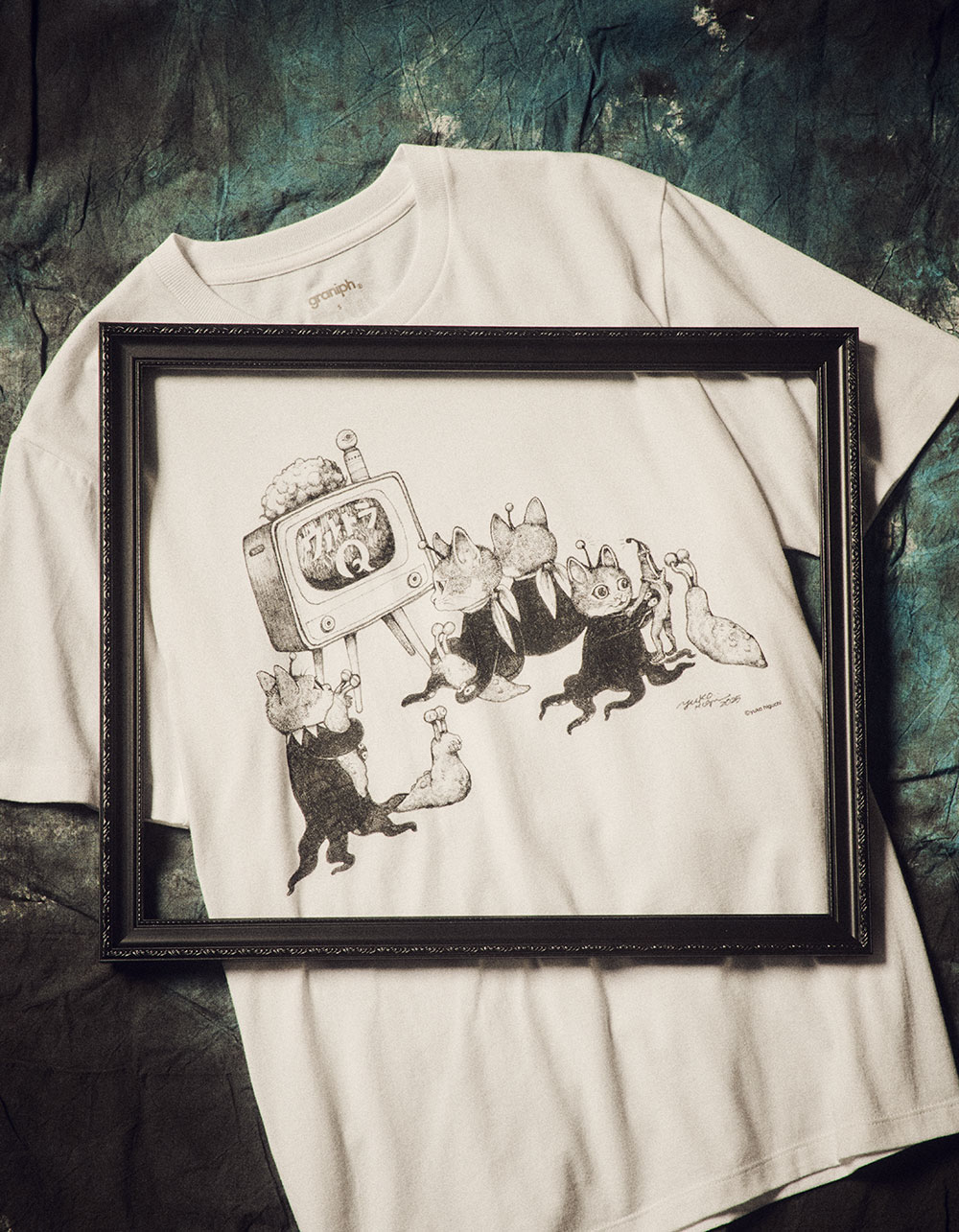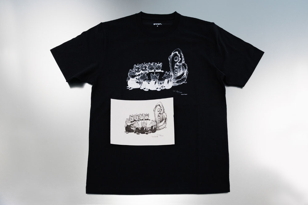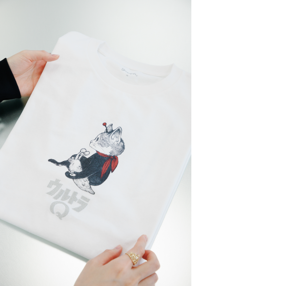 石川「大作に挑戦」Tシャツはフロント中央にギュスターヴくんをプリントし、『ウルトラQ』のロゴをシルバーの刺繍で表現しています。「ロゴと自分の絵が一緒になったらうれしい」とよく仰っていたので、実現できてよかったです。