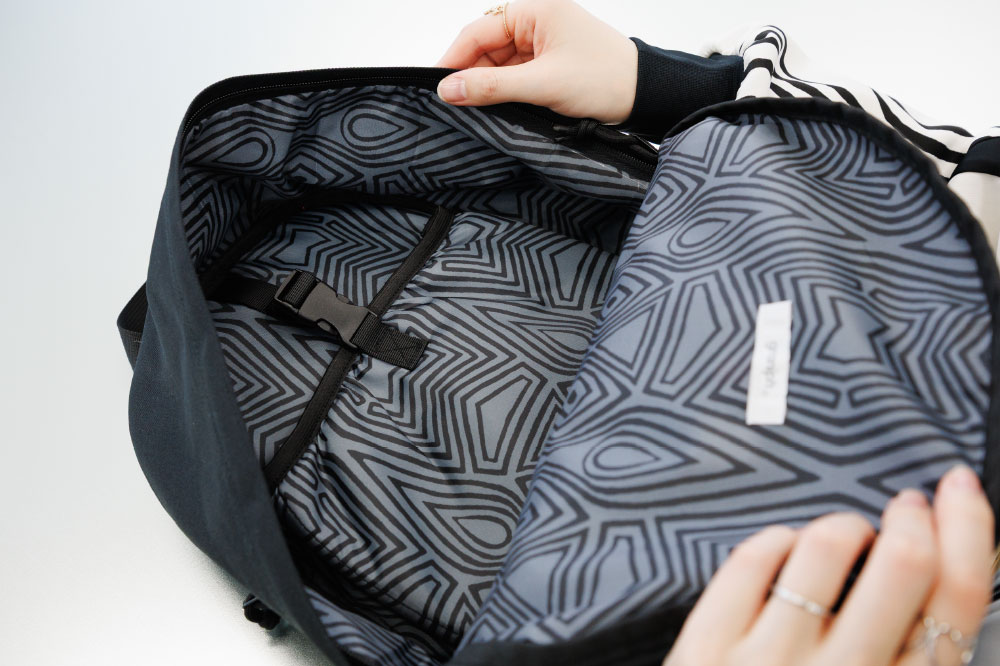 石川こちらはバックパックです。フロントとポケットにダダを刺繍で入れ、派手に主張しすぎないようサイドポケットに模様をプリントしました。