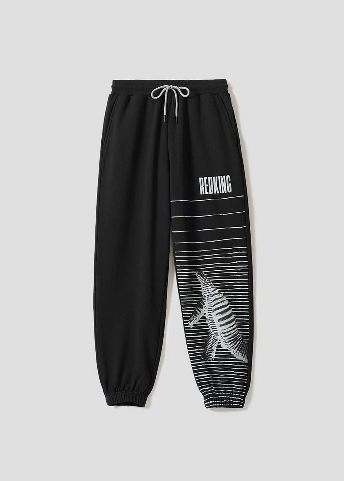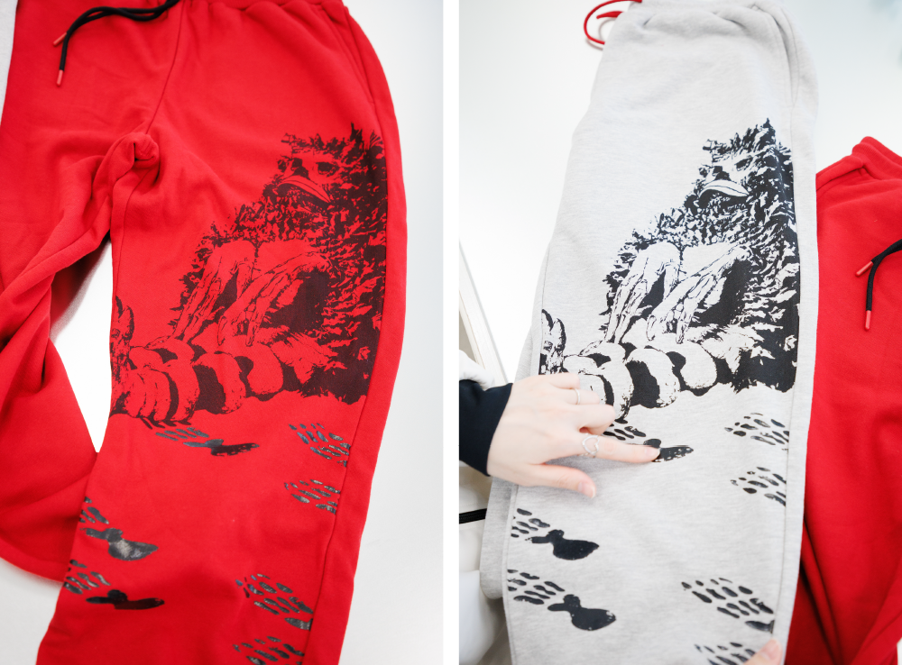 怪獣が持つ模様やシルエットがデザインとしてすごくおしゃれなので、レッドキングも身体のラインで表現したらどうなるかと思いましたが、後ろ姿でそこまで怪獣感を強調せず、おしゃれになりました。後ろポケットにもレッドキングの織りネームがついています。