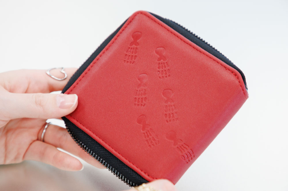 石川いねむりピグモンでお財布も作りました。大きなアップリケと刺繍で表現して、パンツとはまた違う印象をお楽しみいただけます。反対側はピグモンの足跡を型押しして、艶がある仕上がりです。