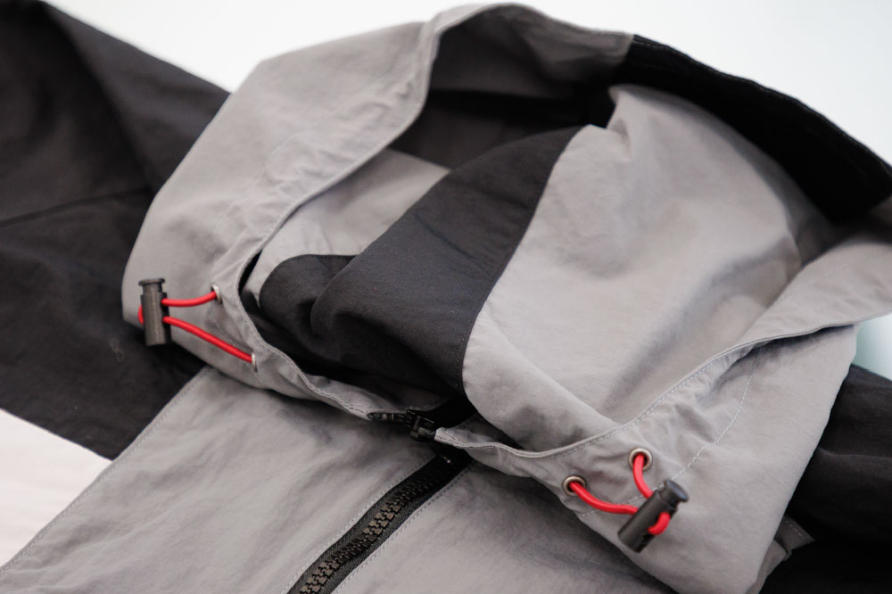石川洋服としても今風を目指したデザインで、袖がリブになっていたり、サイドの紐を引いて裾を絞ってお好みのシルエットに合わせられます。