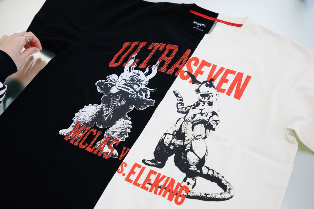 石川ミクラスとエレキングの戦いをモチーフにした「ドッキングTシャツ」と呼ばれるもので、別々のTシャツをくっつけたようなデザインです。「ULTRA」と「SEVEN」のフォントやひび割れの有無で、違うTシャツ感を強調しました。
