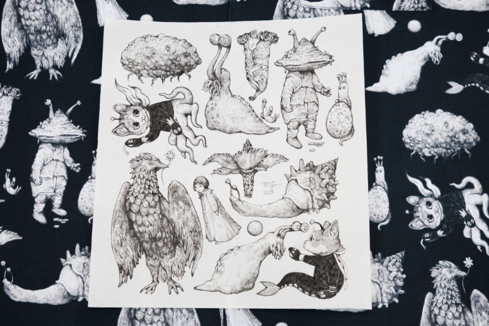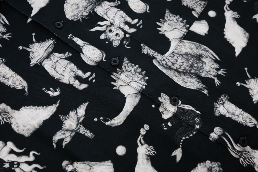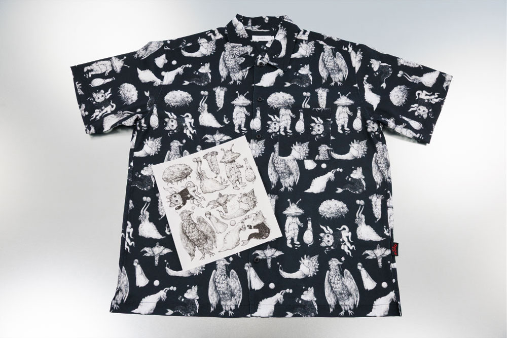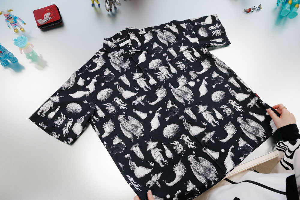 月脚選ぶのは難しいですね…! ヒグチさんに描いていただいたイラストがどれもかわいくて、中でも一番気になったのは総柄シャツです。怪獣がいっぱい身にまとえて、うれしいです。
