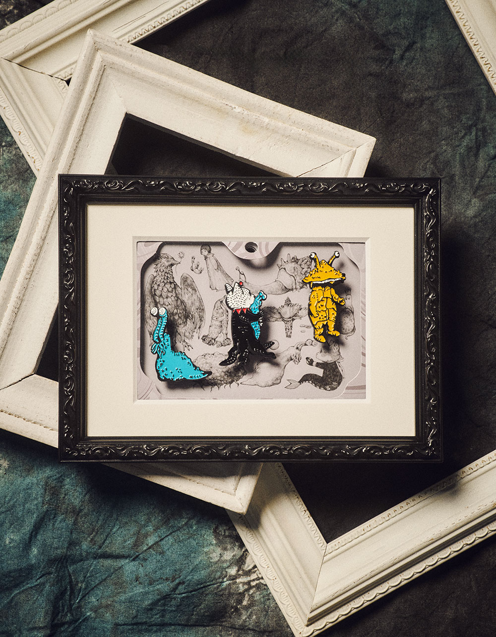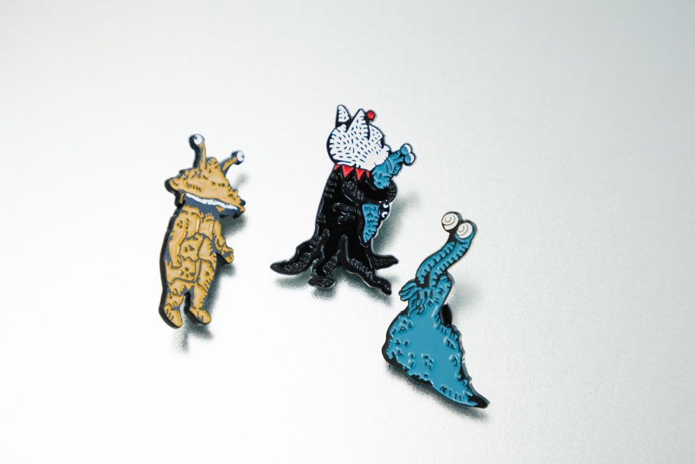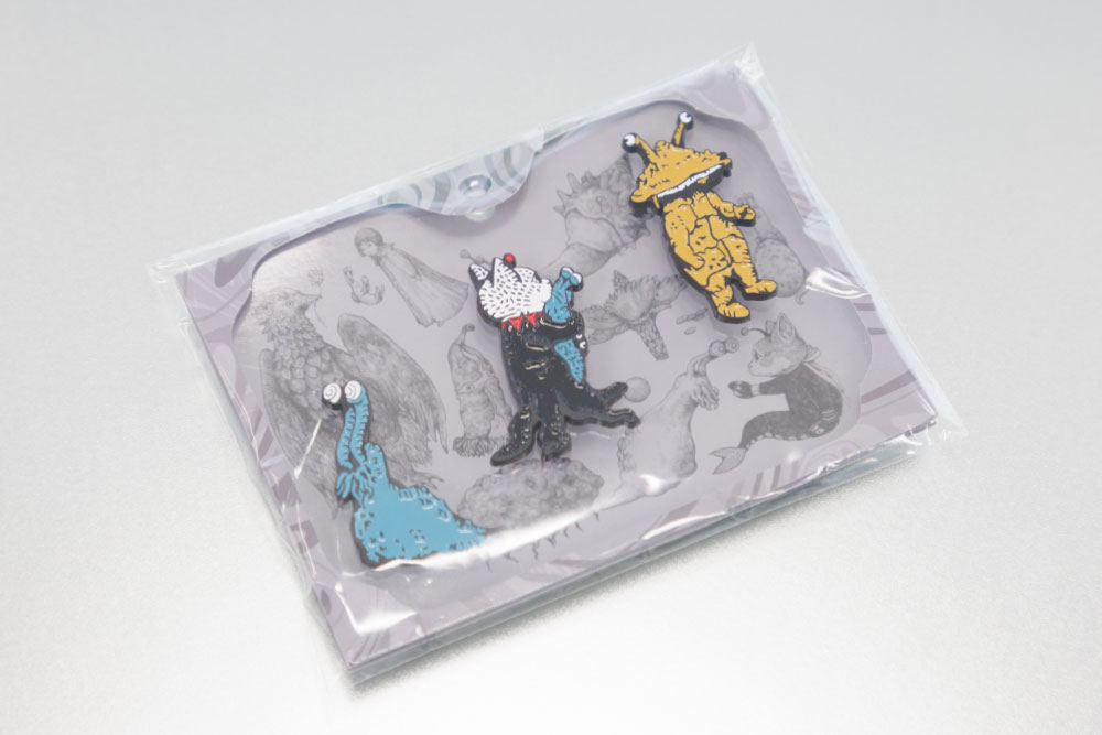 石川そして、ヒグチさんに描いていただいた作品もピンズにしました。台紙にはふんだんにイラストが入っています。
