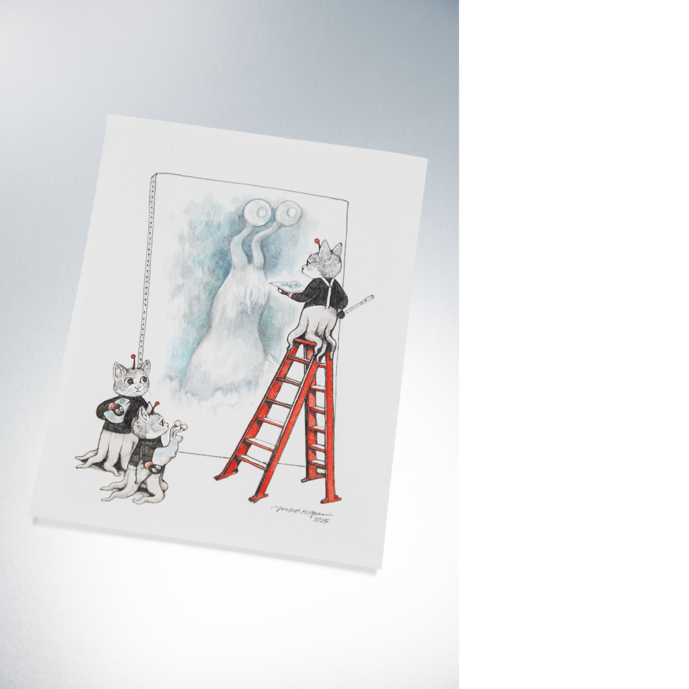 ヒグチユウコたくさんいるギュスターヴくんたちの中で、1号しか絵を描かないので、脚立の上で絵を描いている子は1号で、他の子たちは様子を見ています。魚の頭を持った子がいますが、同時期に進行していた別の絵で頭以外を食べられたので頭のみ残っているというのがリンクしています。