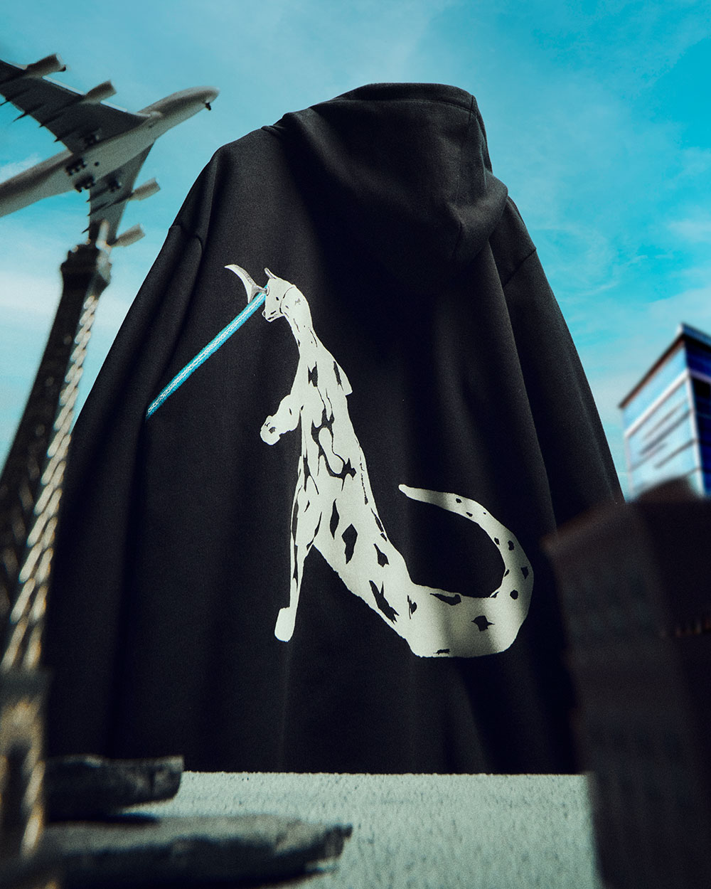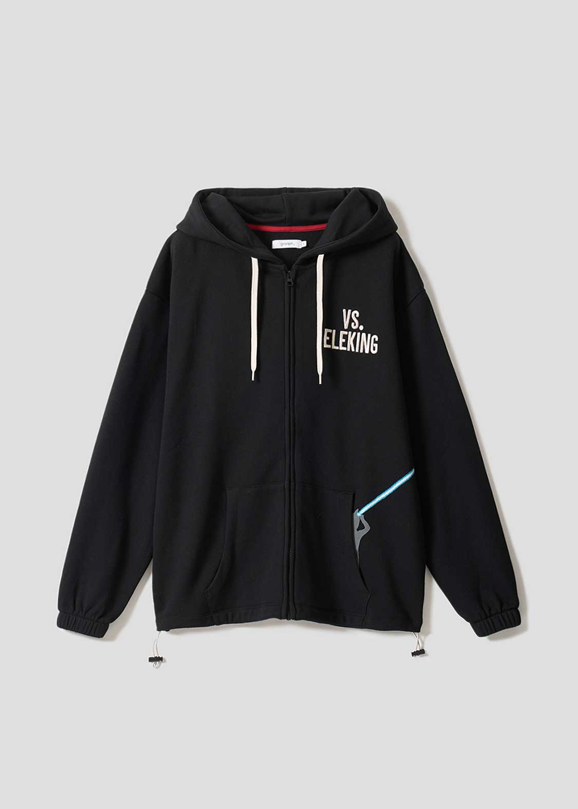 石川ジップパーカはヒーローと戦っている姿も怪獣としての一部なので、ウルトラセブンとエレキングの戦いをシルクプリントで表現しました。前ポケットからウルトラセブンのエメリウム光線が飛び、バックのエレキングにヒットしています。フロントの胸元には「VS.ELEKING」のロゴを存在感のある刺繍であしらっています。