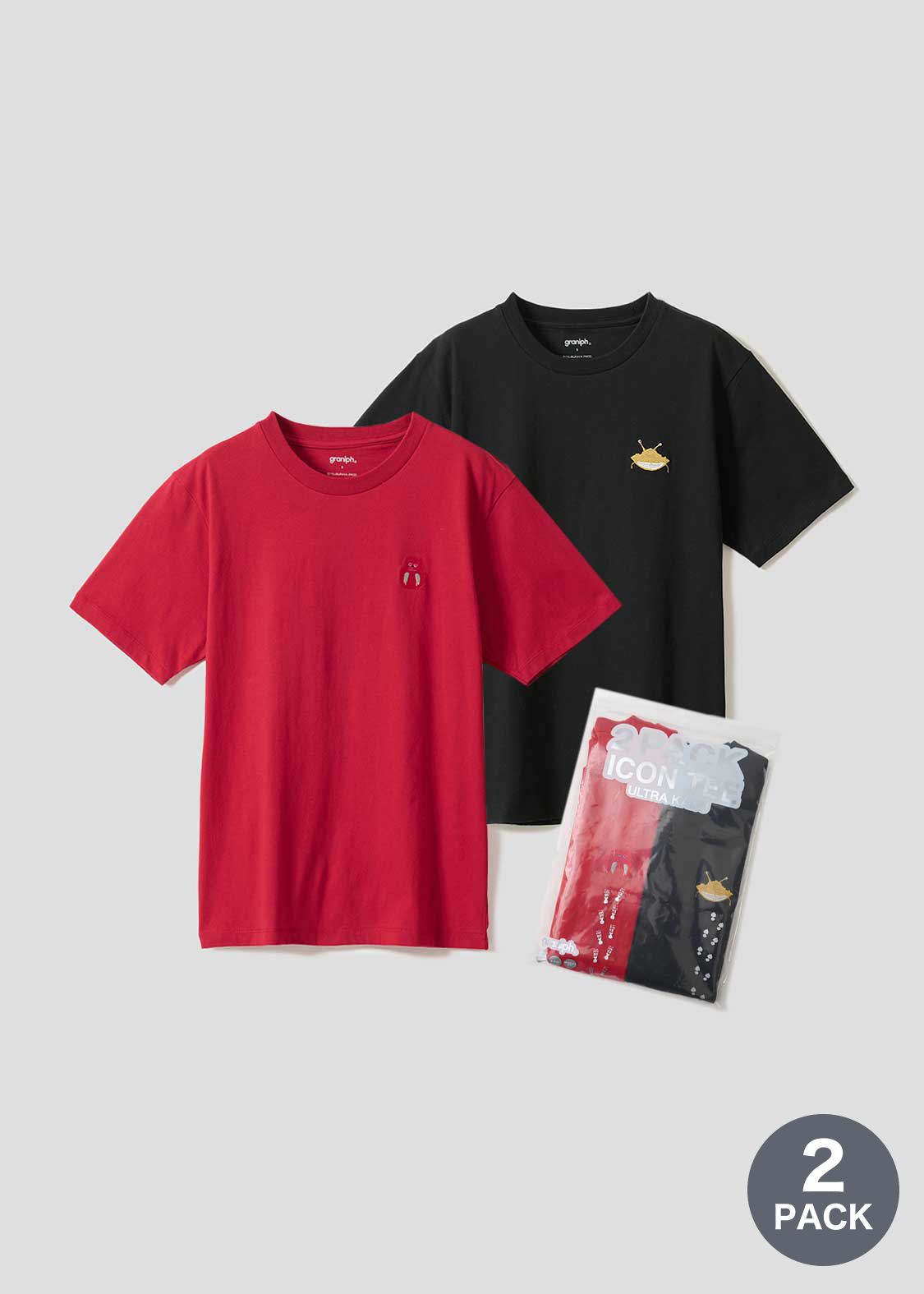 石川2枚のTシャツをセットにした「2パックアイコンTシャツ」です。2色のTシャツにそれぞれピグモンとカネゴンをワンポイント刺繍で入れています。